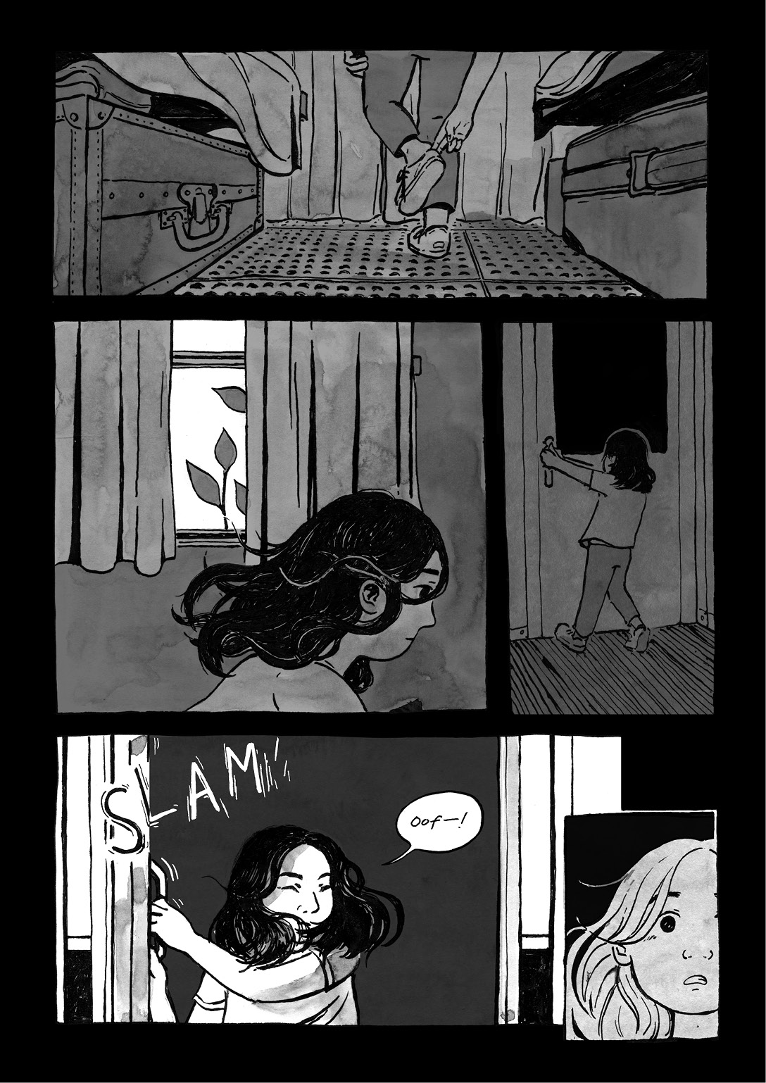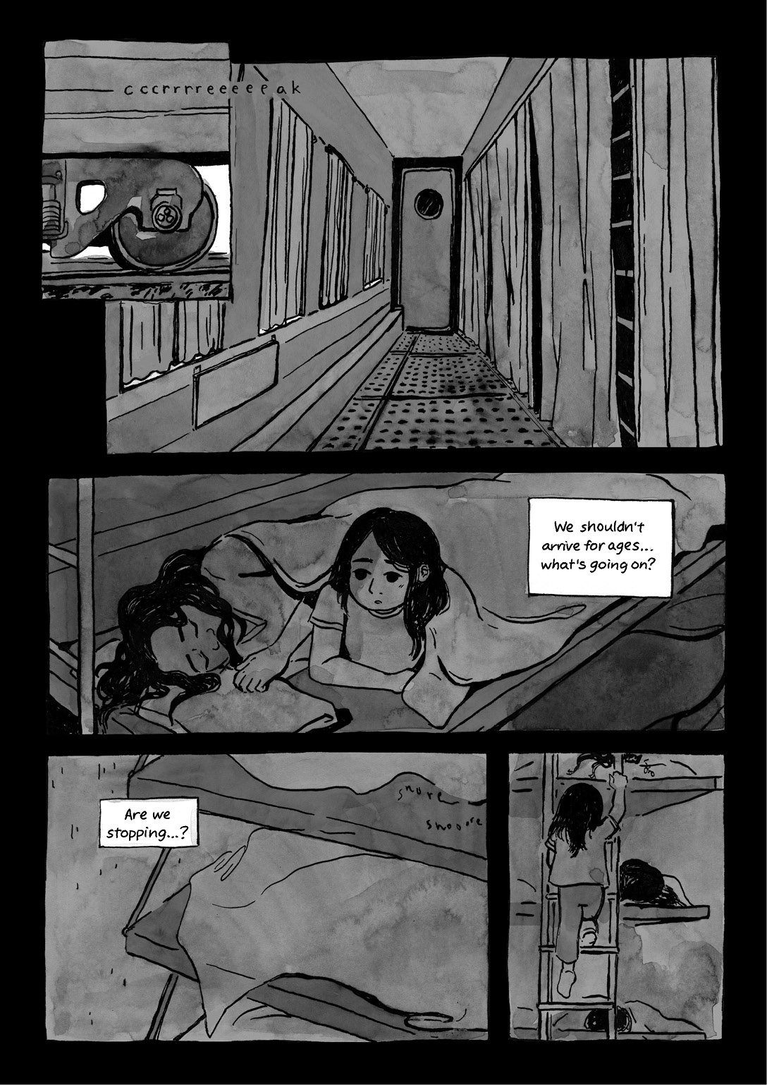 "Sleeper Train" is a 28-page black and white comic, and my fall semester senior thesis. Feifei lives in a small town by a river in China with her mom and grandparents. When a fight between the adults goes too far, Feifei's mom impulsively packs up their lives, and the two of them board an overnight train to the city.